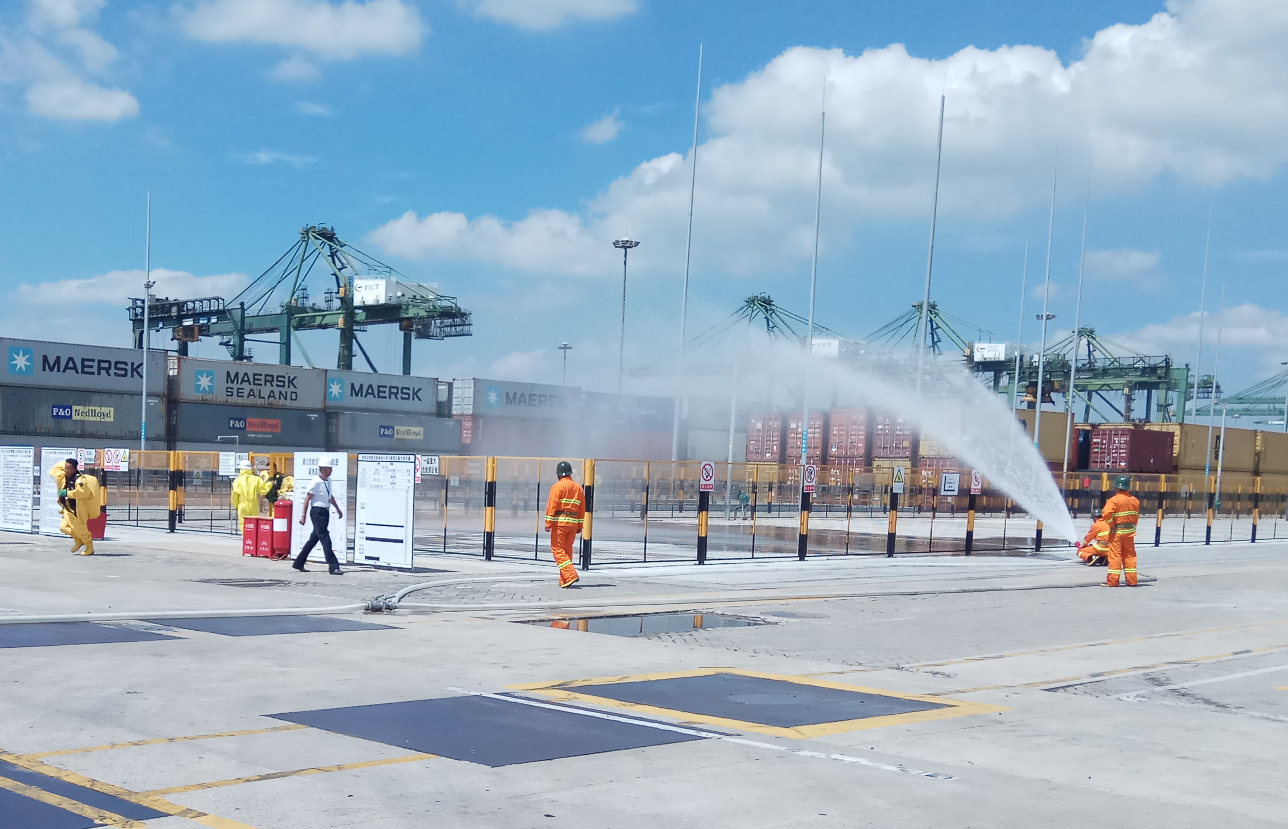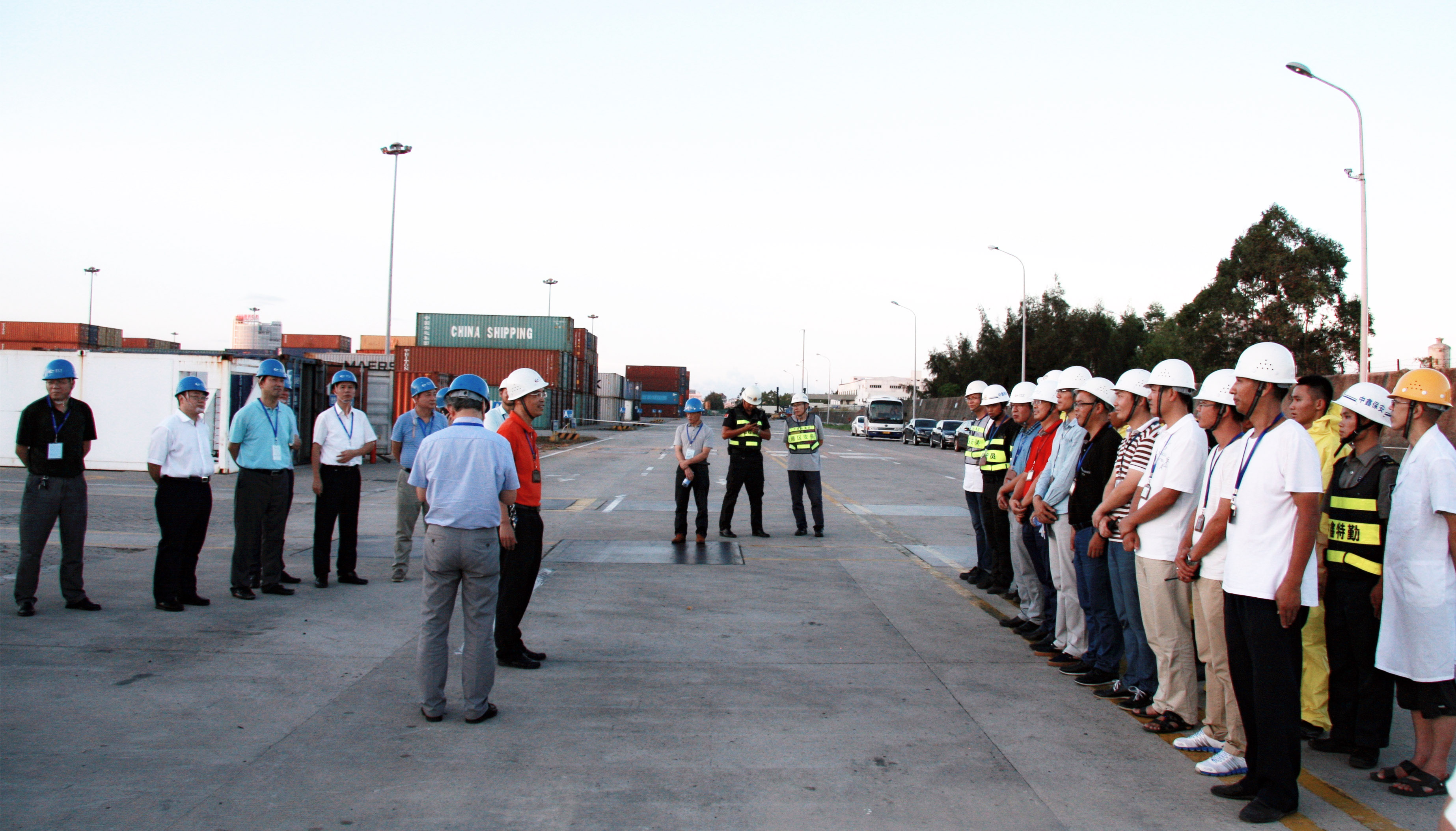 由国家交通运输部水运局局长李天碧率领的交通部安全督查组一行于8月30日莅临江阴港区进行安全生产督查。督查组重点在港区危货集装箱堆场听取了福州港务集团副总经理兼福港集箱总经理郑明和陈枫副总经理对危货堆场改造工程项目建设完成情况以及港口危险货物集装箱的装卸、存储作业安全管理情况的汇报,督查组专家详细检查了堆场安全设施及货物类别布置,询问场上执勤人员的工作职责及应急程序。在现场督查组专家临时假设并指定了某一箱位货柜出现泄漏随后又发生燃烧的场景,公司应对启动了应急预案,组织出动了救援处置队伍。应急状态处置结束后由专家进行了点评并提出了改进日常训练建议。