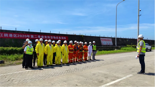 6月17日上午,江阴港区开展第二季度危险货物应急救援专项演练。此次演练模拟危险货物堆场鱼粉柜发生阴燃。重点检验应急救援队的协同作战能力、应急预案的可行性及应急物资配备的合理性。在日常巡逻中危货堆场值班员发现一危货集装箱有冒烟现象,第一时间拉响警报,组织调度组随即启动应急响应,向现场指挥报告,并派出侦查搜救组进入现场侦查,警戒组至危险区域周边拉设警戒线,禁止无关人员进入,疏散组疏散现场人员。侦查组将现场情况向组织调度组报告,组织调度组派出降温组就近接水喷淋降温,灭火组用灭火器闷箱窒息灭火,调派后勤保障组、技术保障组在危险区域外等候指令。最后,危货集装箱阴燃被扑灭,组织调度组指示各救援组清点人数。