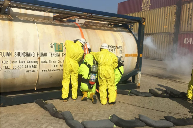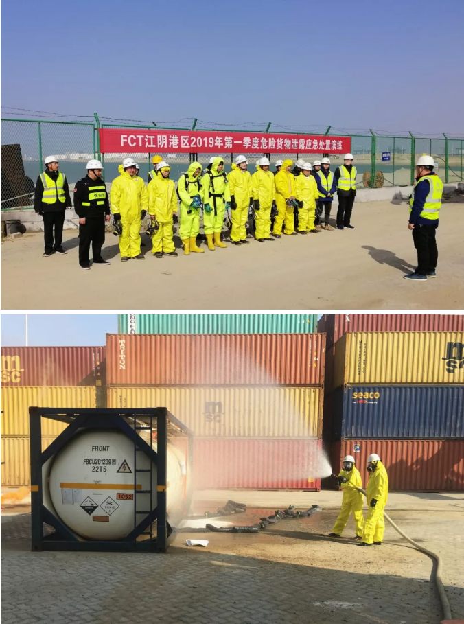 1月18日,江阴港区开展第一季度危险货物应急救援专项演练。此次演练以危险货物无水氟化氢罐柜在5#泊位码头前沿与G01交汇处侧翻跌落发生泄漏为场景。重点检验救援人员对各区域消防设施的熟练使用情况。接到事发拖车司机的报警电话,值班安监员向值班主管报告了突发事件,值班主管随即启动危险货物专项应急响应。救援抢险组、警戒疏散组、技术保障组和后勤保障组人员接到通知后赶赴现场迅速有序、有条不紊地逐项展开救援处置。