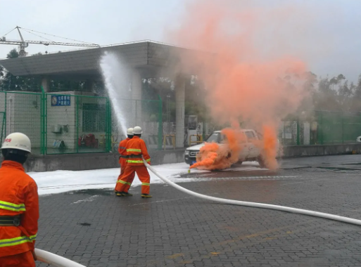 本次演练设定模拟情景为:车辆加油过程中溢油,在加油完成准备驶离、车辆起动时突然车辆和地面起火。