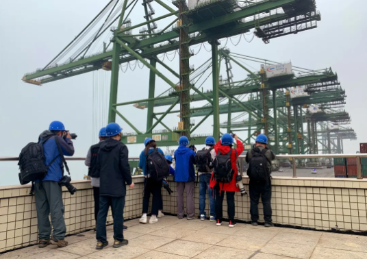 随后,采风团成员走进港区码头,在前沿参观台和6#泊位对港区面貌与作业设备进行拍摄。他们时而俯身下蹲,时而踮脚伸臂,纷纷用手中的摄影器材捕捉码头作业场景,用镜头定格港口人的奋斗风采,向建党100周年献礼。