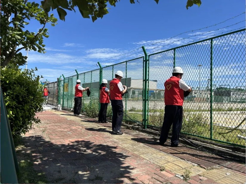 作为港区形象的重要“门面”,围网清洁是环境管理的关键环节。活动中,17名党员与青年志愿者代表一同携带工具,对7#岗周边近500米围网区域进行集中整治。党员们干在前头,青年们紧随其后,分工协作,默契配合。大家仔细清理围网上缠绕的杂绳、布条等杂物,捡拾路面及草丛中的垃圾,并进行分类归集清运。经过努力,该区域围网及周边环境焕然一新,呈现出整洁的“靓门面”。