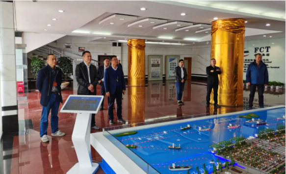 福港集箱副总经理蒋锋陪同调研组一同观看公司宣传片,察看码头前沿生产情况,并向来宾详细介绍了福州港江阴港区1-7#及14#泊位各功能区域、危险货物作业资质、生产经营情况及未来发展规划。随后,调研组进行了座谈。