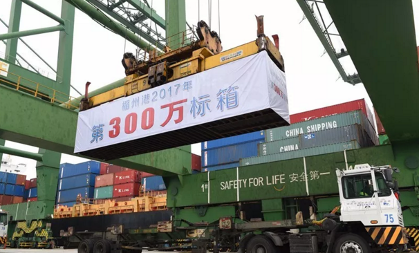 2017年12月28日,福州港江阴港区集装箱码头4号集装箱泊位上,随着带有“福州港2017年第300万标箱”标识的集装箱被装上“乐城”(KOTA LAGU)轮,福州港集装箱年吞吐量首次突破300万标箱大关。