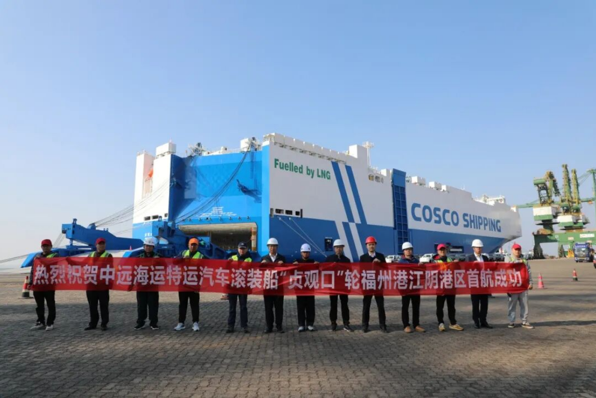 2025年12月4日,由中远海运特运运营、7500个标准车位并采用LNG双燃料动力的大型汽车滚装船“贞观口”轮顺利首航福州港江阴港区并完成装载作业。该轮于今年11月27日在福建厦门顺利下水,此次首航承载689台“福建造”奇瑞汽车,从福建启程驶往中东市场,“福建造”高端船舶与“福建造”汽车协同出海,展现了福建制造、产业配套与港口物流链深度协同发展的新进展。