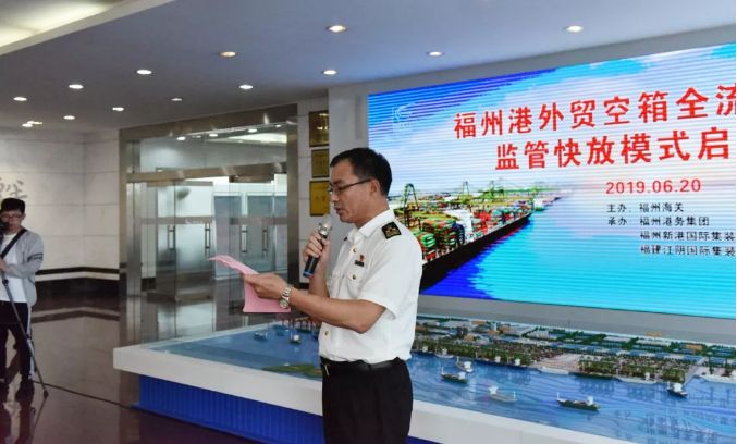 担任本次启动仪式主持的福州海关口岸监管处黄见超副处长介绍:空箱新监管模式,是福州海关聚焦进境空箱“手续繁、通关慢、成本高”这一全国口岸普遍存在的通关难题,积极响应习总书记倡导“数字福建”的战略决策,为进一步提升福州港营商环境,解决福州港外贸空箱周转慢等实际问题,协同福港集箱、船公司、物流场站等共同研究空箱监管新模式,经过多次调研、反复探讨、集思广益、开拓创新、优化流程,通过“制度+科技”创新再造空箱通关流程,统一申报单证、统一作业系统、统一风险研判、统一指令下达、统一现场执法,对未被布控查验的进境空箱允许企业直接提离港区,在减环节、降成本、快放行的同时优化了海关监管。