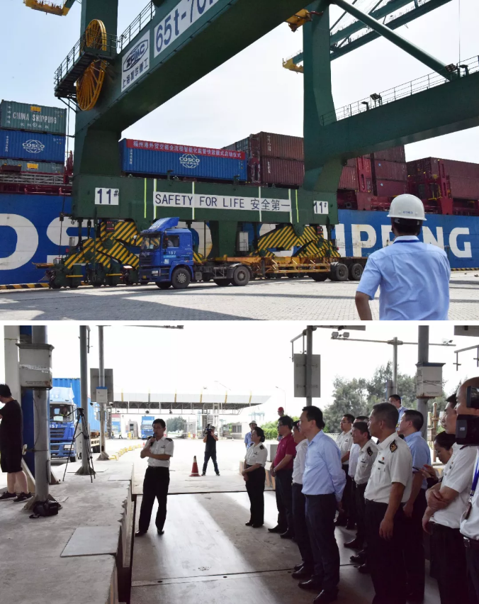 14:30分,随着福州港江阴港区码头4#泊位上中远海运集装箱班轮“新海口”上第一个外贸空箱卸船,通过港区3#智能卡口的超感型空箱检测设备检测出闸,并顺利转运到福港物流有限公司堆场的那一刻,标志着空箱监管新模式模式已经正式实施。