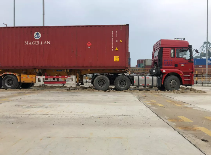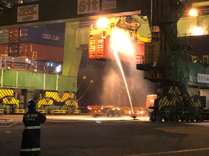 在应急处置小组的指挥下,23:30货主方代表穿戴防护器具携带便携式检测仪上船检测并报告确认在安全范围内,23:45福清消防对泄漏危险货物箱周边挥发气体进行稀释、降温,23:52泄漏箱周边障碍箱吊离结束。12月21日0:05在福清消防全程喷淋稀释和监护下,安全起吊危化品柜,于0:12落到专业危险货物运输车上,0:15在引导车的带领下,顺利将该泄漏箱拖运至A10危险货物专用堆场。