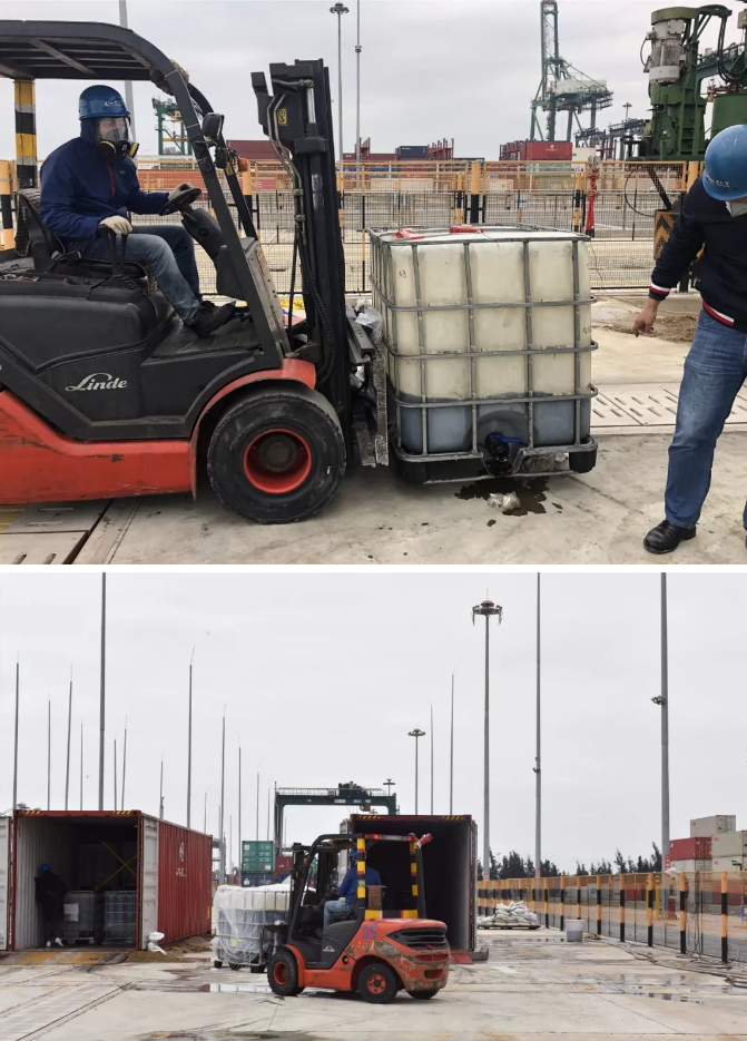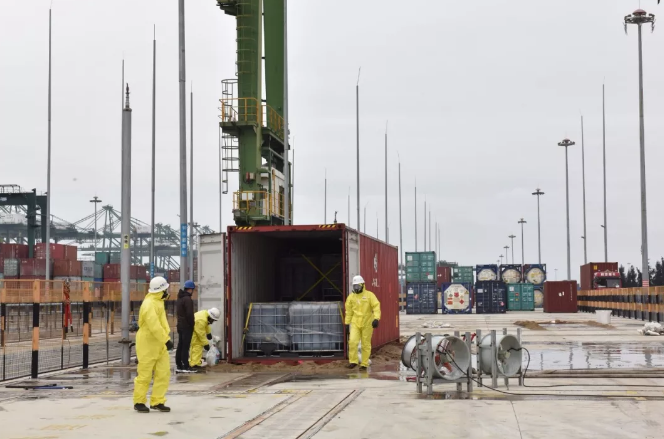 应急救援小组找出桶装危化品泄漏处,在专业团队的协作下,妥善进行处置:对12月22日泄漏危化品集装箱(箱号:FCIU9528663)实施封堵,确认不再泄漏,并进行专业处置。对泄漏较严重的危化品集装箱(箱号:MAGU5327264)采取将箱内危化品转移至指定空箱(也称倒箱),找到泄漏点并进行妥善处置后,装回箱内。处置后两个泄漏危化品集装箱于当天16:18提离港区。