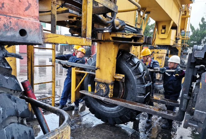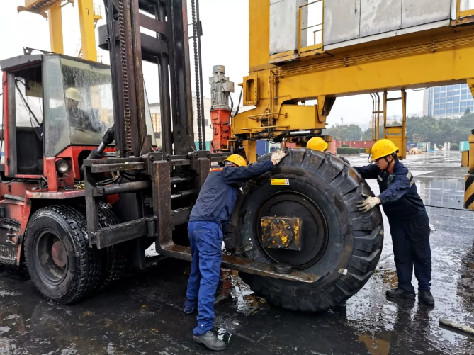 1月17日,天空中下起了冬雨,雨水冰凉,寒风刺骨,冬日的雨天让室外作业显得格外艰难,浸透了衣服的雨水,吹拂在背上的寒风,都让维修工作变得更加辛苦。但是不论环境多么艰苦,安全都是雷打不动的头等大事,容不得丝毫大意和麻痹。技术部员工用默契的合作,加倍的细心,加倍的努力来克服恶劣的天气影响。经技术部场桥组的同事们不懈努力和紧张抢修,顺利完成了2#轮胎吊的大车换胎任务,有力地保障港区的安全生产。