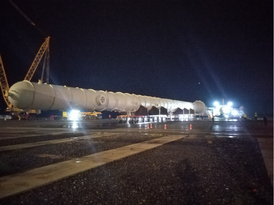 2.14中国软包装集团福建美得石化有限公司两件特大件设备通过滚装卸船的作业模式成功完成了在福州港江阴港区的卸船、转运任务,福州港江阴港区打破了接卸单件重量最高的新纪录,这也是国内石化设备运输史上单件最重最长的运输和滚装。2件特大件设备分别为丙烯丙烷精馏塔和脱乙烷汽提塔。其中丙烯丙烷精馏塔重1700吨,最大直径13.15米,长118.45米;脱乙烷汽提塔重988吨,直径7米,长59.78米。