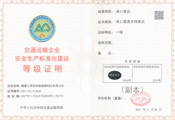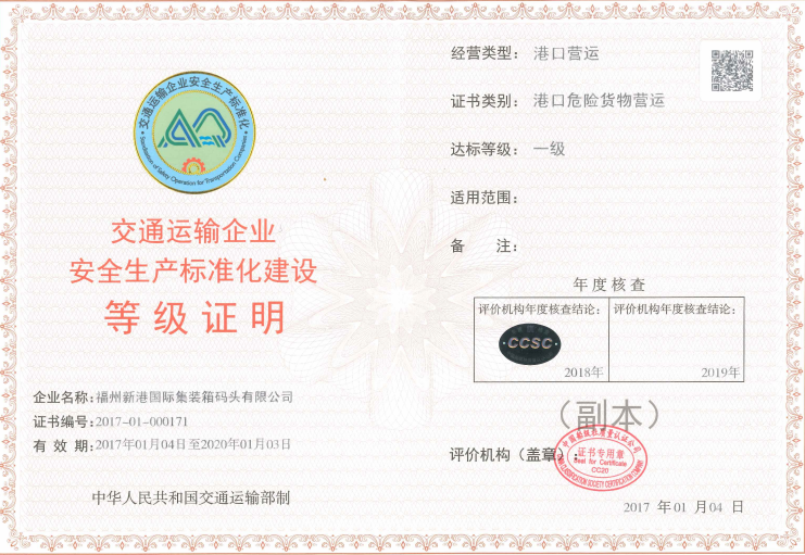 1.10??交通运输部认定福州新港国际集装箱码头有限公司和福州青州集装箱码头有限公司为第四批交通运输企业安全生产标准化一级达标企业,资质证书有效期自2014年1月10日起至2017年1月9日。